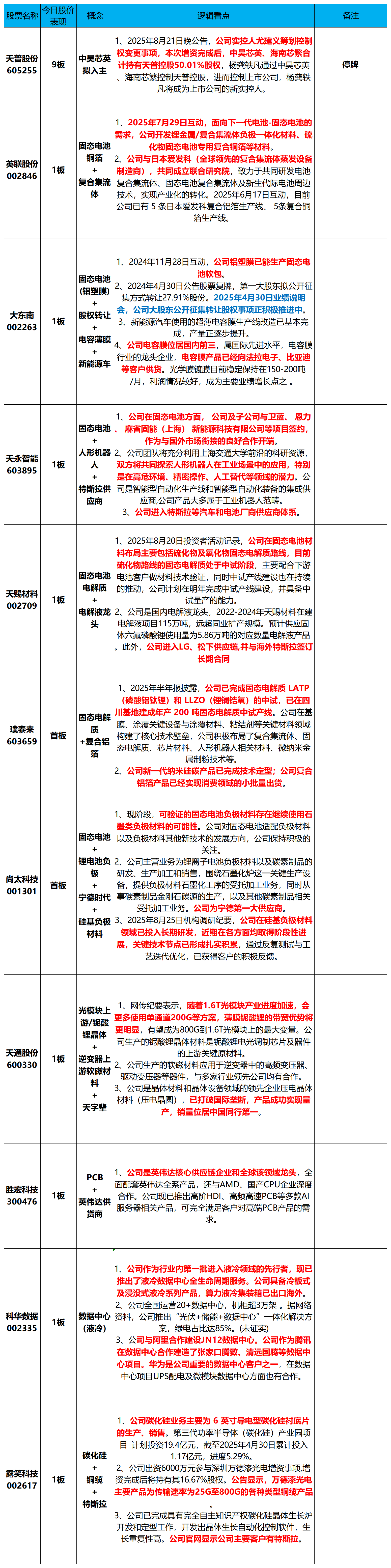英联股份002846、大东南002263、天永智能603895、天赐材料002709、璞泰来603659、尚太科技001301、