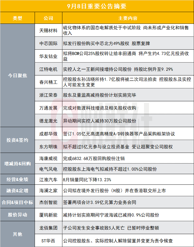 中芯国际(688981.SH)公告称,公司拟向国家集成电路产业投资基金等发行股份购买中芯北方49%的股权,股票自2025年9月1日停牌,预计停牌时间不超过10个交易日,并于9月9日起复牌。中芯北方作为中芯国际的控股子公司,主要为客户提供不同工艺平台的12英寸集成电路晶圆代工及配套服务。本次交易完成后,上市公司在标的公司的持股比例将从51%上升至100%。截至本预案摘要签署日,本次交易的审计、评估工作尚未完成,标的资产的评估值及交易价格尚未确定。