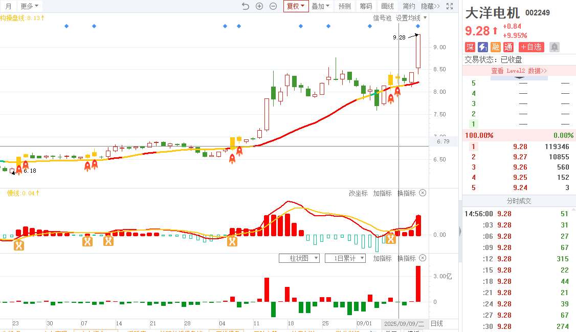 2)20250909-大洋电机-四维操盘-近期出现火箭信号且底部量柱由绿转红