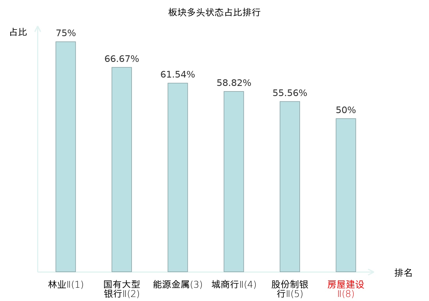 全市场所有行业板块中主力多头状态占比排名中,林业Ⅱ板块位居第一。专业连锁Ⅱ板块名次提升最快,较昨日上升63位。
