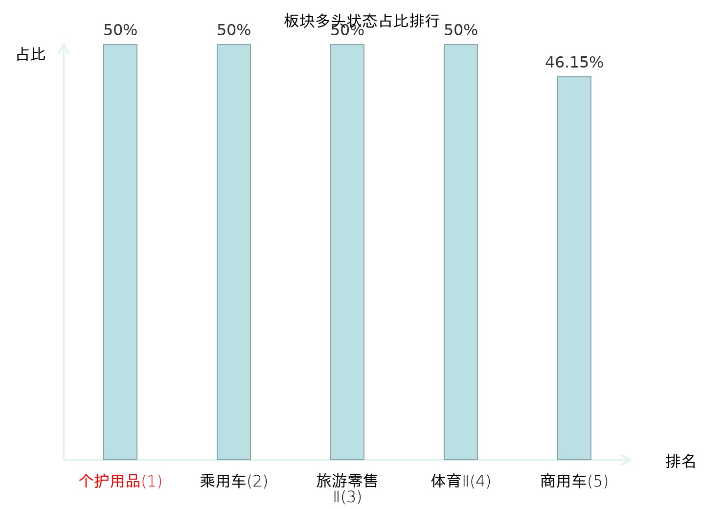 全市场所有行业板块中主力多头状态占比排名中,个护用品板块位居第一。林业Ⅱ板块名次提升最快,较昨日上升94位。