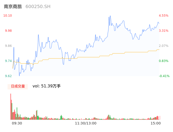 04月03日,南京商旅收报10.04,股价涨幅3.93%,成交金额5.05亿元,换手率18.09%。