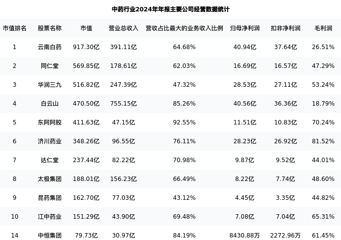 中恒集团最新报告期数据为年报,下表汇总了中药行业内市值靠前的公司年报主要经营数据