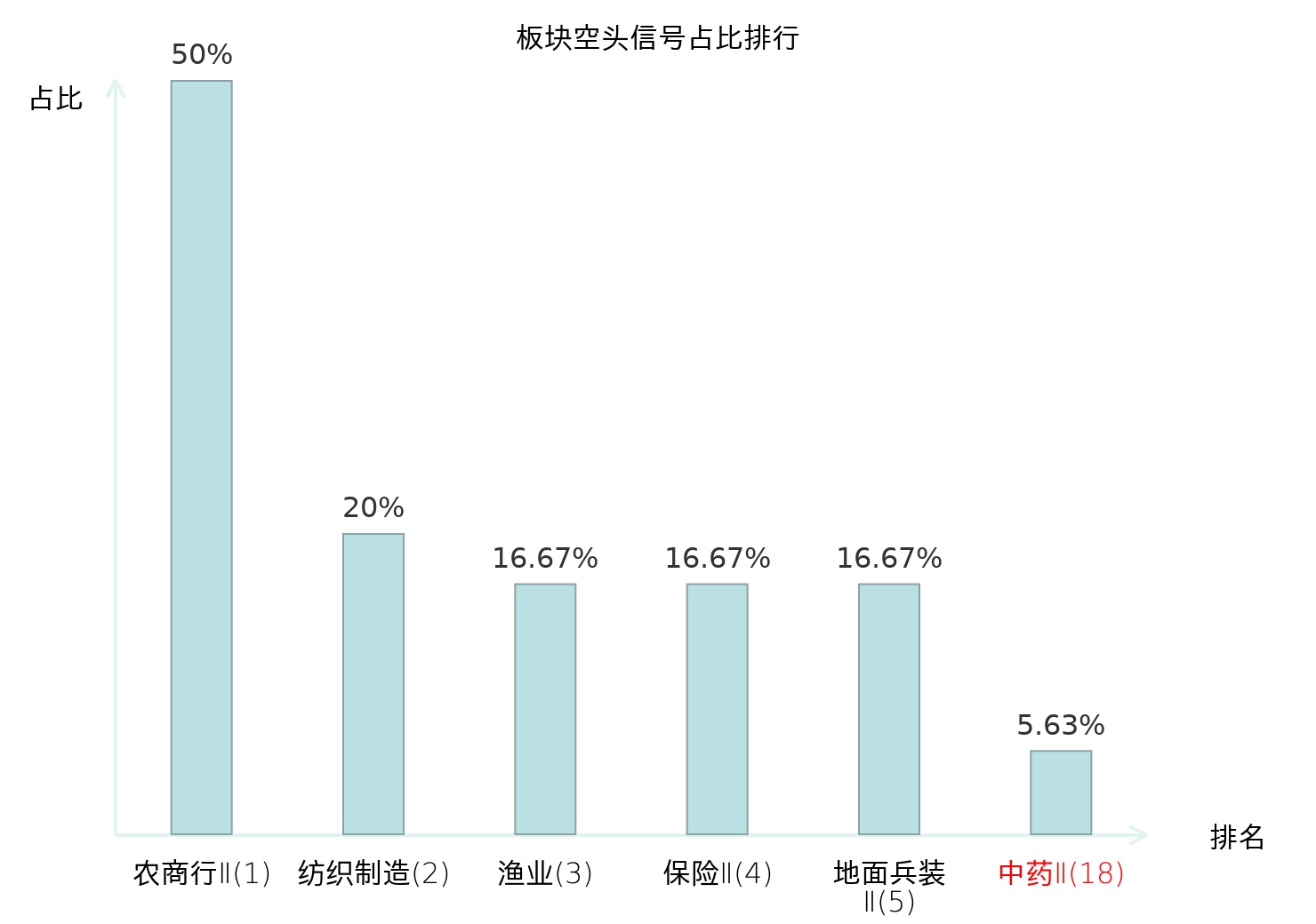 全市场所有行业板块中主力空头信号占比排名中,农商行Ⅱ板块位居第一。生物制品板块名次提升最快,较昨日上升121位。