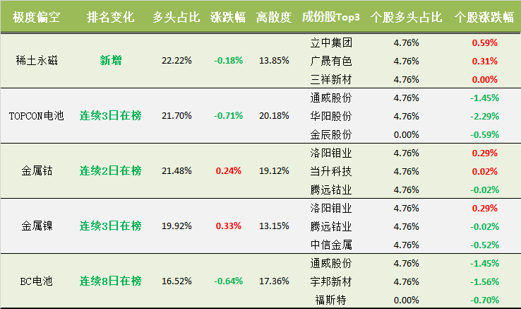 极度弱势概念:稀土永磁、TOPCON电池、金属钴、金属镍、BC电池。