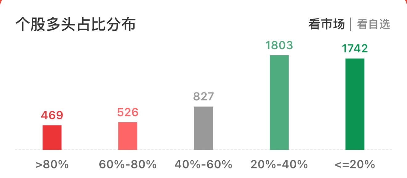 A股市场多空占比极度强势个股469只,偏多方向个股526只,多空均衡方向个股827只,偏空方向股票继续上升至1803只,极度偏空股票上升至1742只;