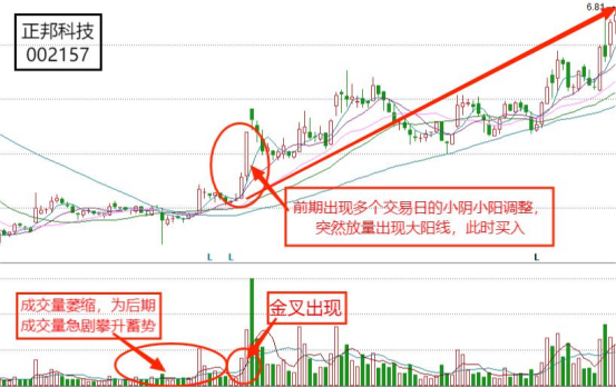 由图中正邦科技的日K线走势图可以看出,这是一个典型的“长阳重炮”形态,前期的缩量调整+大阳线放量上涨同时具备,此时若在最佳买点介入,接下来逐渐震荡上涨,利好行情凸显。