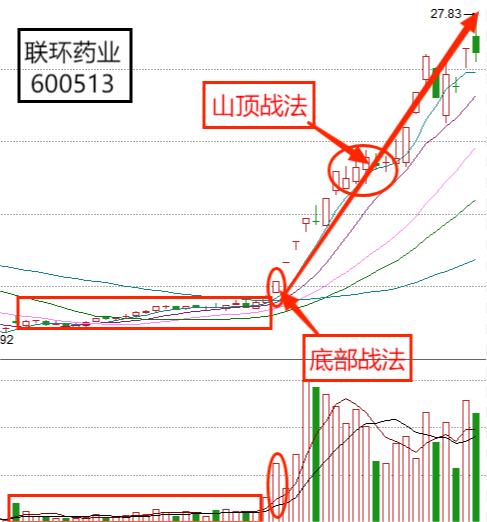 在这个案例里还能看出“山顶战法”的影子,如果在底部没能及时介入,上升趋势+小幅调整+大阳线追入是典型的“山顶战法”,此时介入为时也不晚,依旧有获利空间。