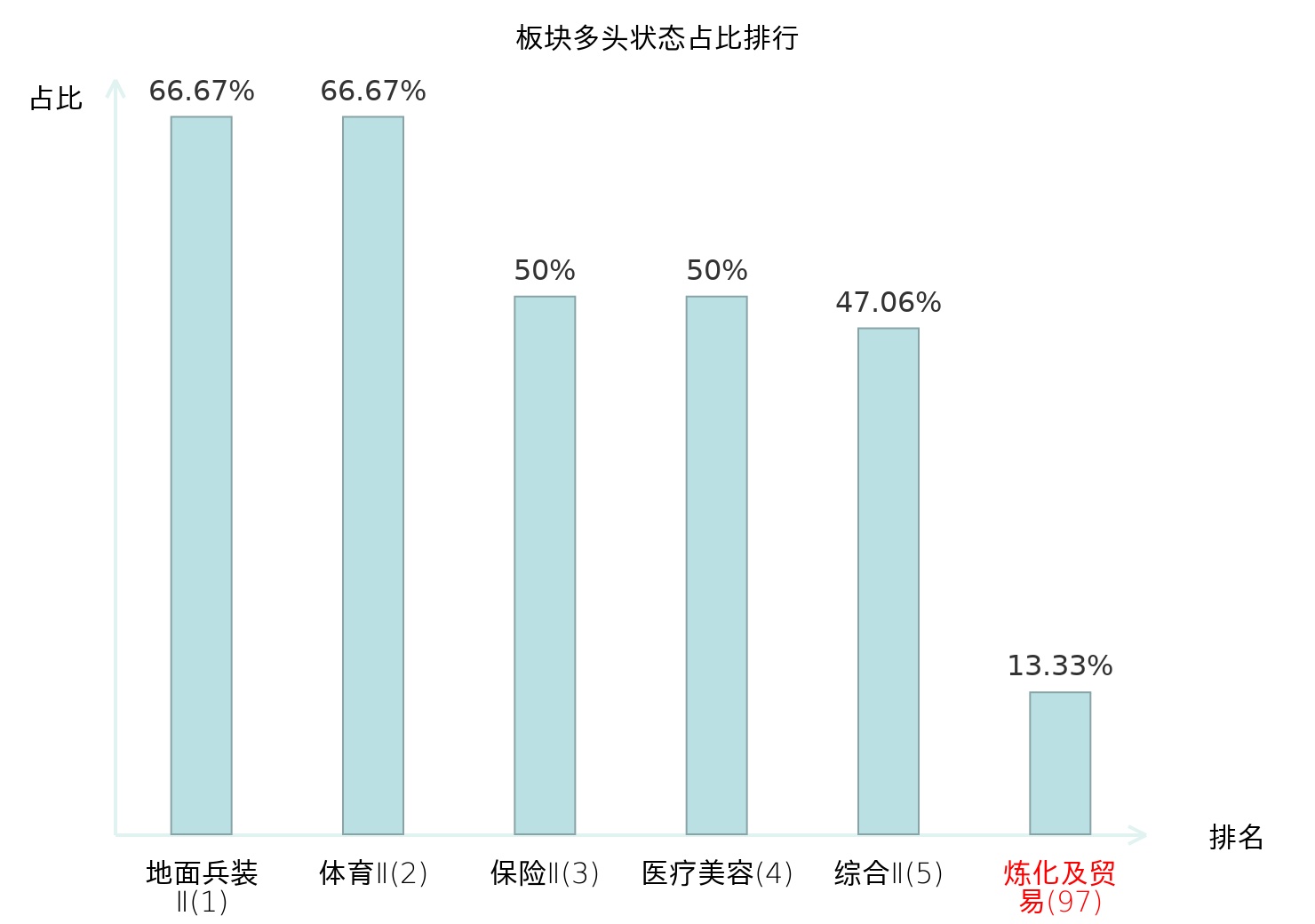 全市场所有行业板块中主力多头状态占比排名中,地面兵装Ⅱ板块位居第一。保险Ⅱ板块名次提升最快,较昨日上升82位。