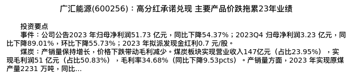 值得注意的是:2024年04月浙商证券的任宇超/邹骏程分析师,首次发布关于广汇能源的研究报告,标题为:广汇能源(600256):高分红承诺兑现 主要产品价跌拖累23年业绩。