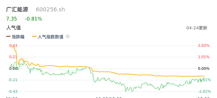 04月24日,广汇能源收报7.35,股价涨幅-0.81%,成交金额8.32亿元,换手率1.73%。
