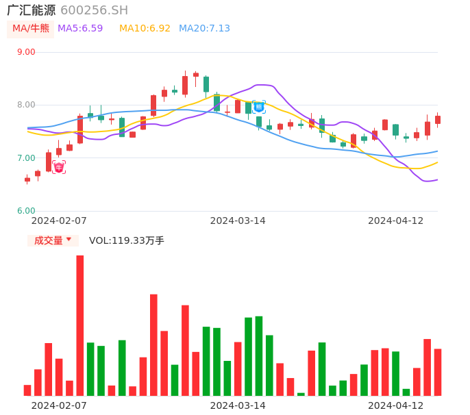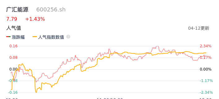 04月12日,广汇能源收报7.79,股价涨幅1.43%,成交金额9.25亿元,换手率1.82%。