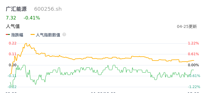04月25日,广汇能源收报7.32,股价涨幅-0.41%,成交金额5.03亿元,换手率1.05%。