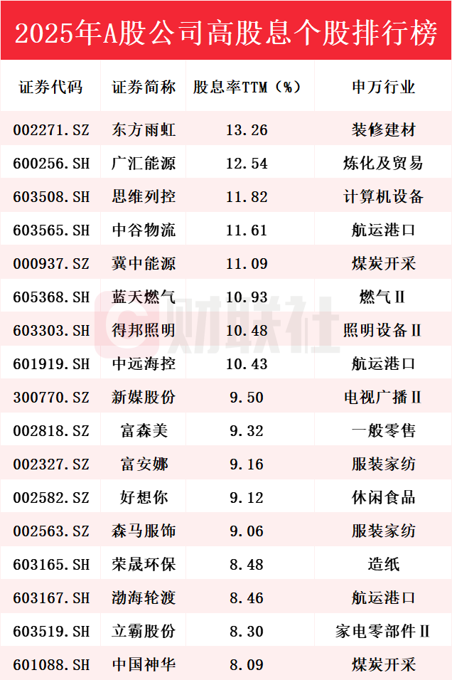 wind数据显示,东方雨虹股息率高达13.26 %,位列第一。广汇能源、思维列控位列第二、第三,股息率分别为12.54%、11.82%。排名第四至第十的个股分别为中谷物流、冀中能源、蓝天燃气、得邦照明、中远海控、新媒股份和富森美,股息率在9%-12%之间。具体情况如下图: