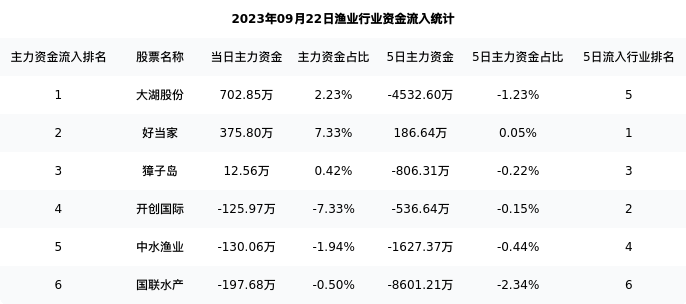 大湖股份今日净流入702.85万元,主力占比2.23%,在行业内排名:1/6;5日净流出4532.60万元,主力占比1.23%,在行业内排名:5/6。
