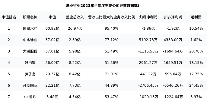 大湖股份最新报告期数据为半年度,下表汇总了渔业行业内市值靠前的公司半年度主要经营数据
