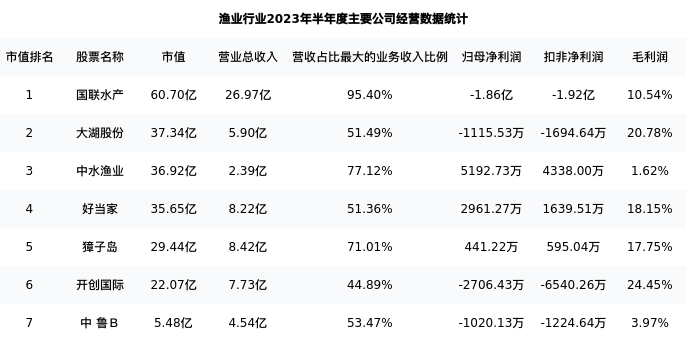 大湖股份最新报告期数据为半年度,下表汇总了渔业行业内市值靠前的公司半年度主要经营数据