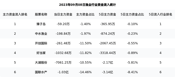 从主力资金流向来看,渔业行业今日主力资金流入3.62亿元,在所有申万二级行业中排名:114/131。