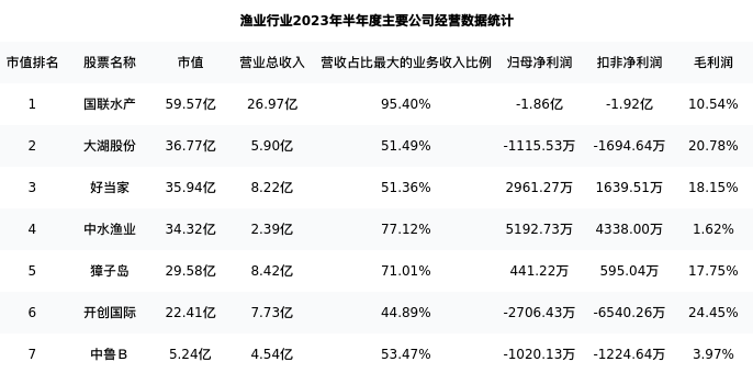 大湖股份最新报告期数据为半年度,下表汇总了渔业行业内市值靠前的公司半年度主要经营数据