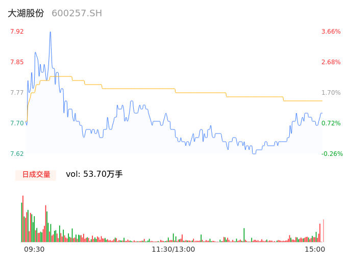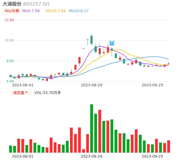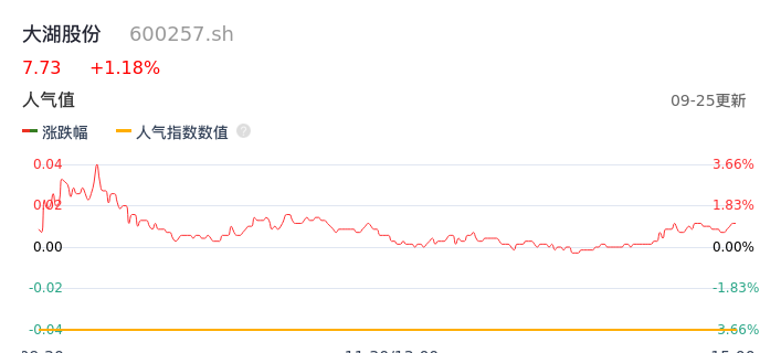 09月25日,大湖股份收报7.73,股价涨幅1.18%,成交金额4.16亿元,换手率11.16%。