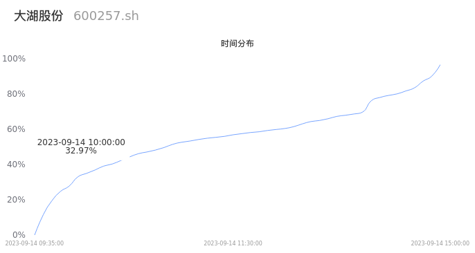 600257大湖股份2023年09月14日成交77.93万手,成交金额6.03亿元,相较昨日缩量23.53万手,换手率16.19%,成交活跃。