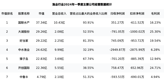 大湖股份最新报告期数据为一季度,下表汇总了渔业行业内市值靠前的公司一季度主要经营数据