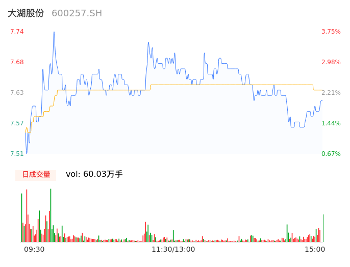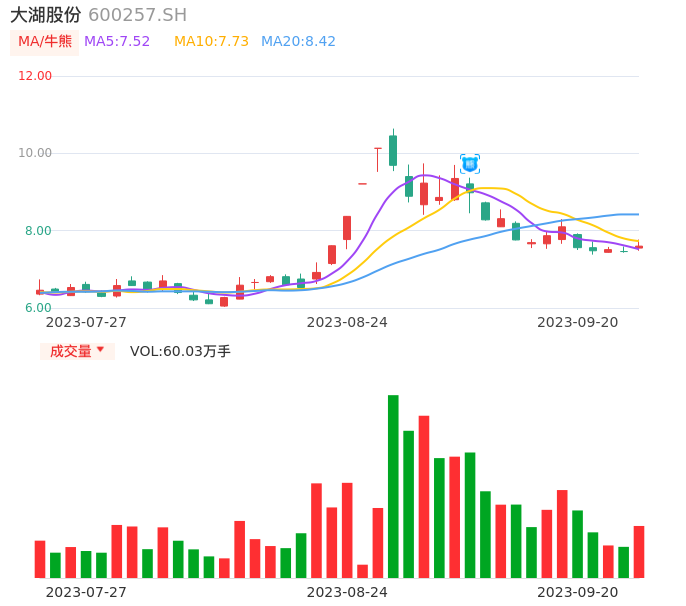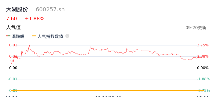 09月20日,大湖股份收报7.60,股价涨幅1.88%,成交金额4.58亿元,换手率12.47%。