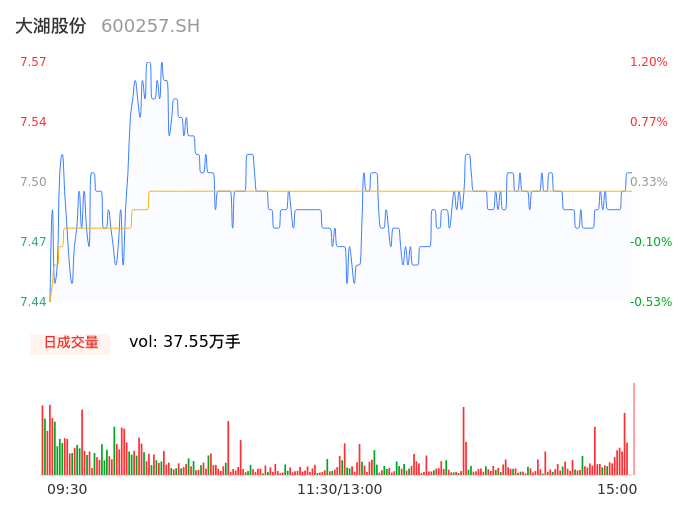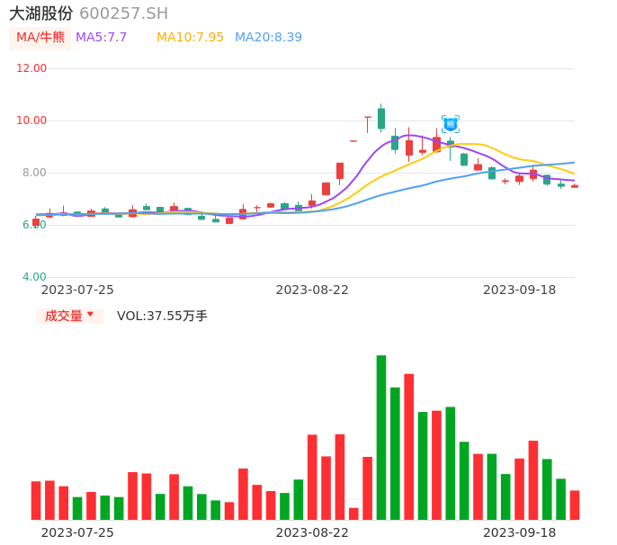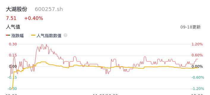 09月18日,大湖股份收报7.51,股价涨幅0.40%,成交金额2.82亿元,换手率7.80%。