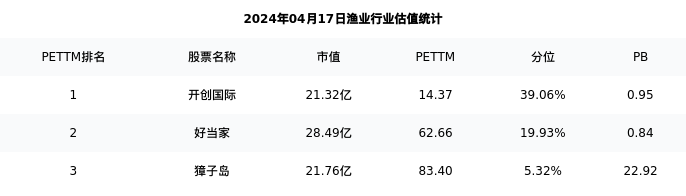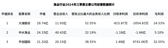 大湖股份最新报告期数据为三季度,下表汇总了渔业行业内市值靠前的公司三季度主要经营数据