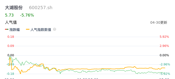 04月30日,大湖股份收报5.73,股价涨幅-5.76%,成交金额2.93亿元,换手率10.43%。