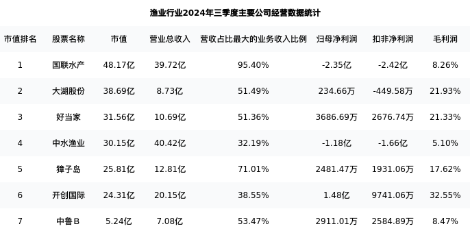 大湖股份最新报告期数据为三季度,下表汇总了渔业行业内市值靠前的公司三季度主要经营数据