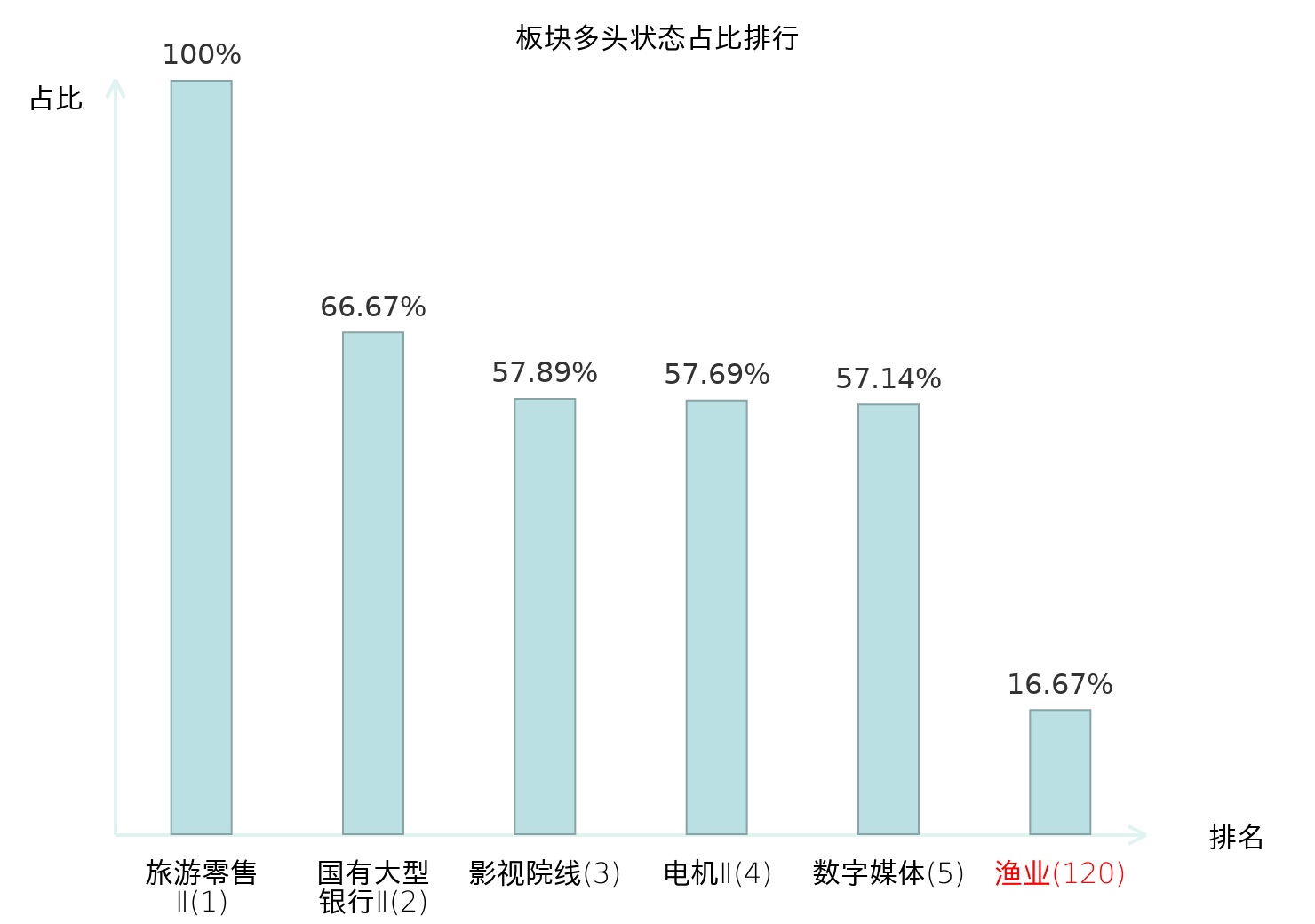 全市场所有行业板块中主力多头状态占比排名中,旅游零售Ⅱ板块位居第一。专业连锁Ⅱ板块名次提升最快,较昨日上升56位。