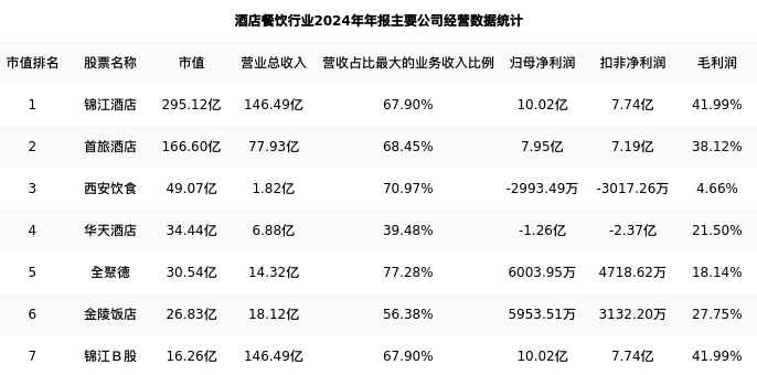 首旅酒店最新报告期数据为年报,下表汇总了酒店餐饮行业内市值靠前的公司年报主要经营数据