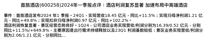 值得注意的是:2024年05月光大证券的陈彦彤/汪航宇/聂博雅分析师,首次发布关于首旅酒店的研究报告,标题为:首旅酒店(600258)2024年一季报点评:酒店利润复苏显著 加速布局中高端酒店。