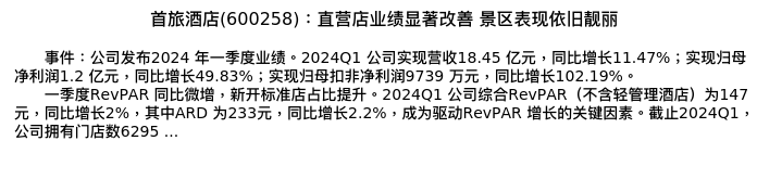值得注意的是:2024年05月财通证券的刘洋分析师,首次发布关于首旅酒店的研究报告,标题为:首旅酒店(600258):直营店业绩显著改善 景区表现依旧靓丽。