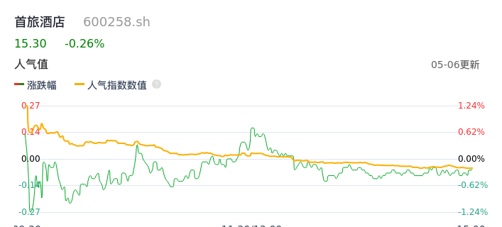 05月06日,首旅酒店收报15.30,股价涨幅-0.26%,成交金额5.02亿元,换手率2.94%。