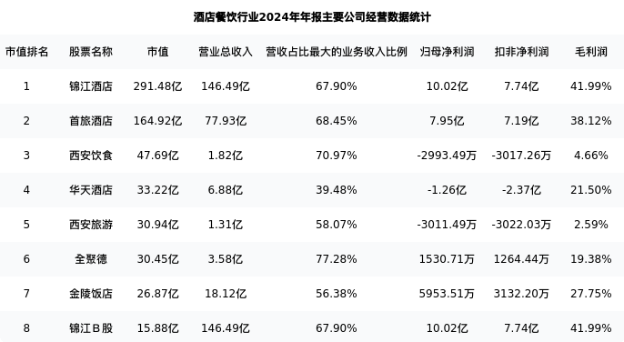 首旅酒店最新报告期数据为年报,下表汇总了酒店餐饮行业内市值靠前的公司年报主要经营数据