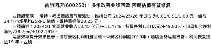 值得注意的是:2024年04月国泰君安的刘越男/于清泰分析师,首次发布关于首旅酒店的研究报告,标题为:首旅酒店(600258):多维改善业绩回暖 预期估值有望修复。