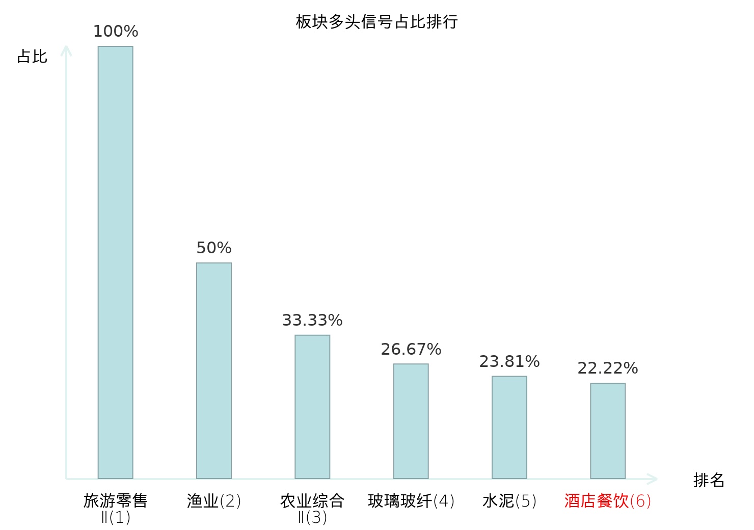 全市场所有行业板块中主力多头信号占比排名中,旅游零售Ⅱ板块位居第一。旅游零售Ⅱ板块名次提升最快,较昨日上升130位。