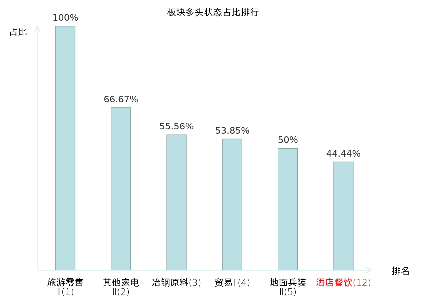 全市场所有行业板块中主力多头状态占比排名中,旅游零售Ⅱ板块位居第一。房屋建设Ⅱ板块名次提升最快,较昨日上升58位。
