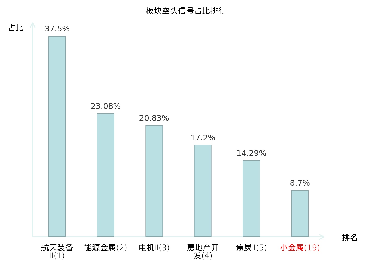 全市场所有行业板块中主力空头信号占比排名中,航天装备Ⅱ板块位居第一。房地产开发板块名次提升最快,较昨日上升125位。