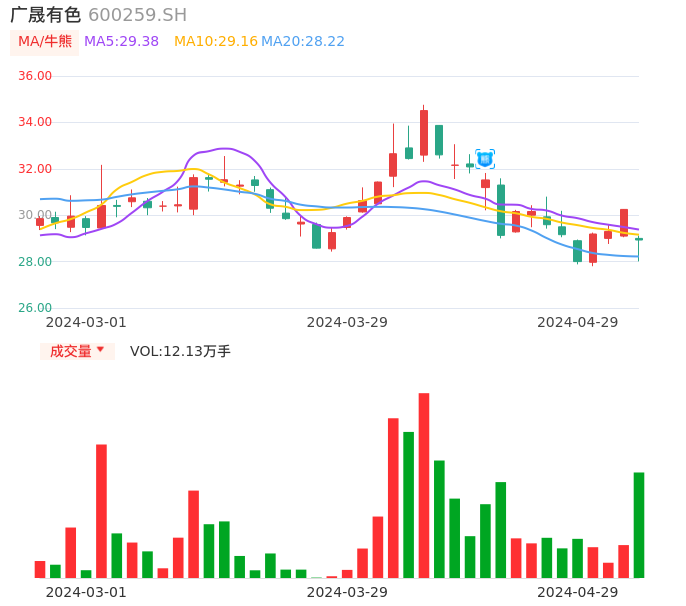 04月29日,广晟有色收报28.93,股价涨幅-4.36%,成交金额3.47亿元,换手率3.68%。