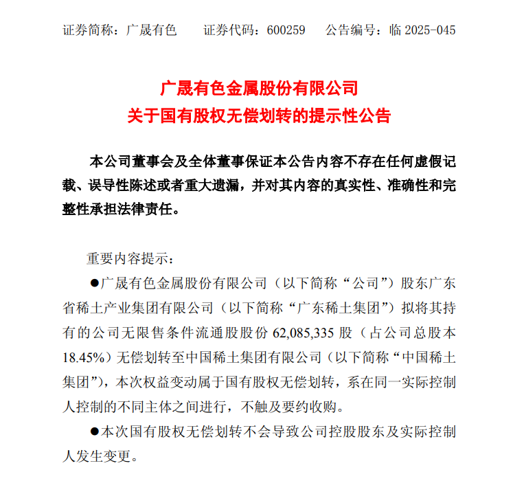 8月29日晚公告,为进一步深化集团内部资源整合,优化资源配置,提升产业集中度,广晟有色股东广东稀土集团与中国稀土集团近期签署了《无偿划转协议》,拟将其持有公司6208.53万股(占公司总股本18.45%)股份,无偿划转至中国稀土集团。