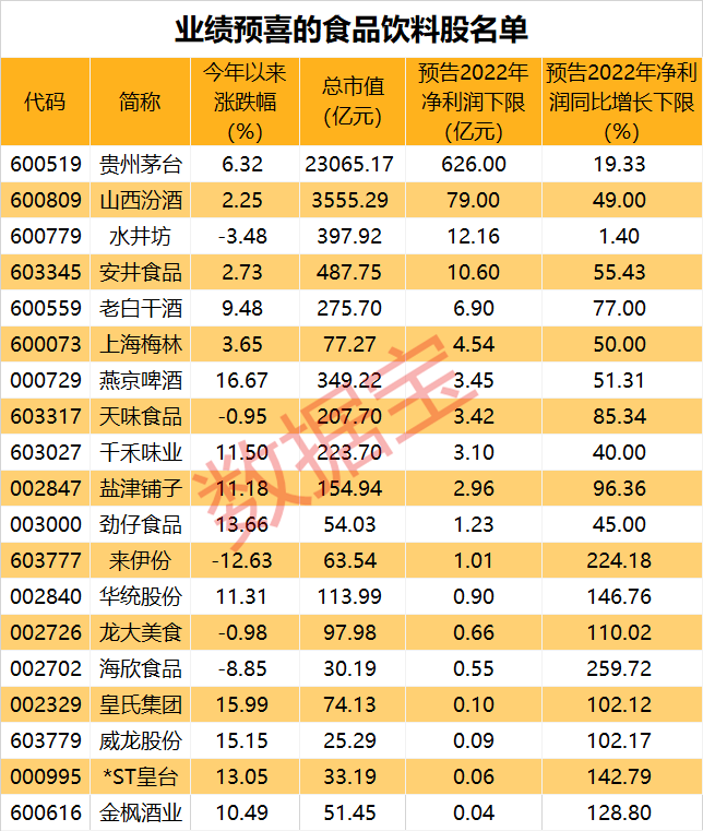 盐津铺子、天味食品、老白干酒等股的2022年业绩均实现较大幅度增长,业绩增幅下限均超50%。