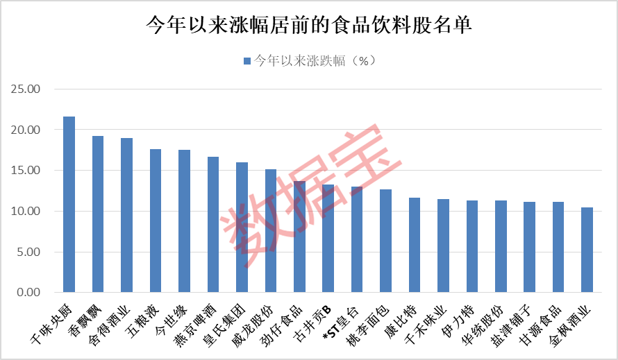 今年以来,千味央厨、香飘飘、五粮液、燕京啤酒等涨幅居前,均超15%。