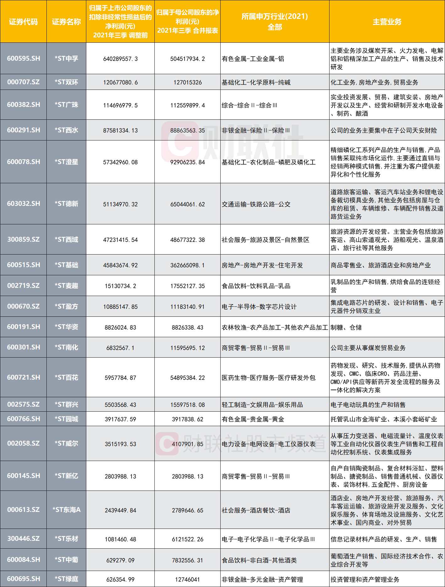 *ST中孚在众多ST股中业绩表现最为亮眼,公司前三季度主营收入106.61亿元,同比上升104.43%;归母净利润5.05亿元,扣非净利润6.4亿元。单第三季度来看,主营收入36.96亿元,同比上升74.9%,归母净利润1.19亿元,扣非净利润2.41亿元。公司表示,营收与净利大增主要因为前三季度电解铝及铝精深加工产品销量增加与铝价上涨所致。