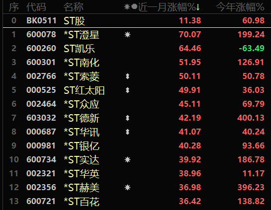 近期,ST股板块成为市场焦点,截止今日午间收盘,板块指数近六日上涨近5.1%,个股也涨幅明显。以近一个月股价涨幅来统计,*ST澄星涨近70%,位列板块第一,ST凯乐涨近64%,此外,十余只个股涨幅逾30%,近八成个股上涨。