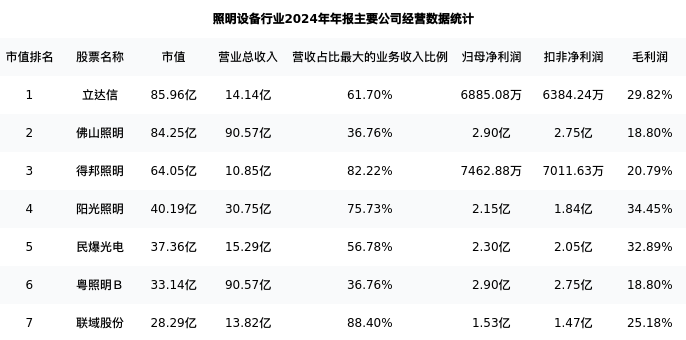 阳光照明最新报告期数据为年报,下表汇总了照明设备行业内市值靠前的公司年报主要经营数据