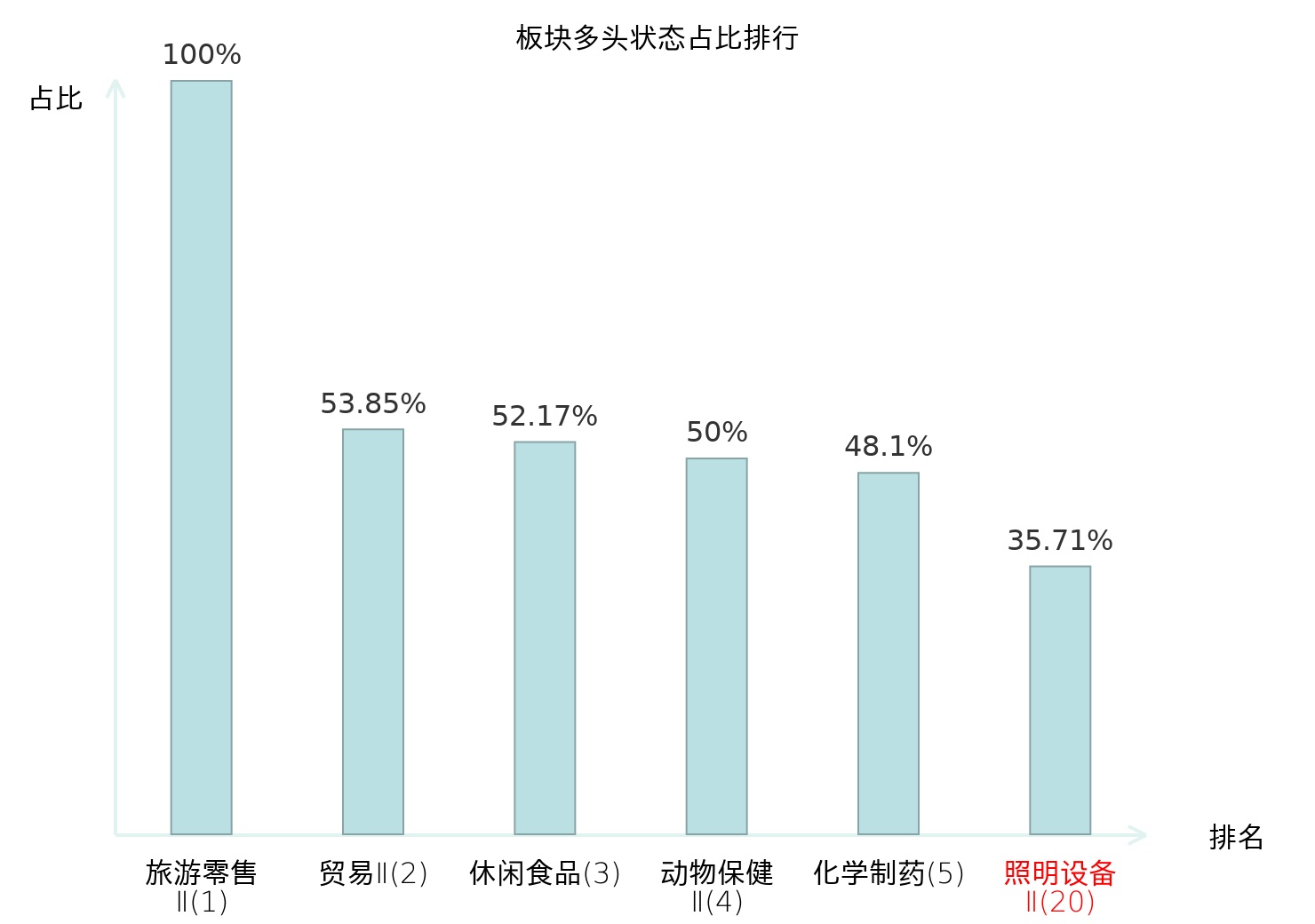 全市场所有行业板块中主力多头状态占比排名中,旅游零售Ⅱ板块位居第一。白酒Ⅱ板块名次提升最快,较昨日上升47位。