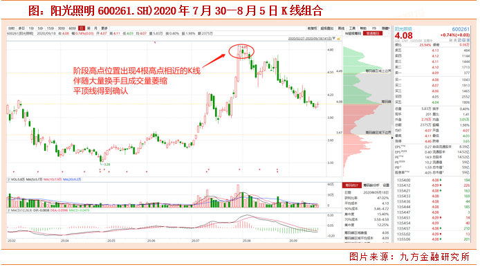 华东医药(000963.SH)2020年7月14日—15日K线组合、阳光照明600261.SH)2020年7月30—8月5日K线组合。